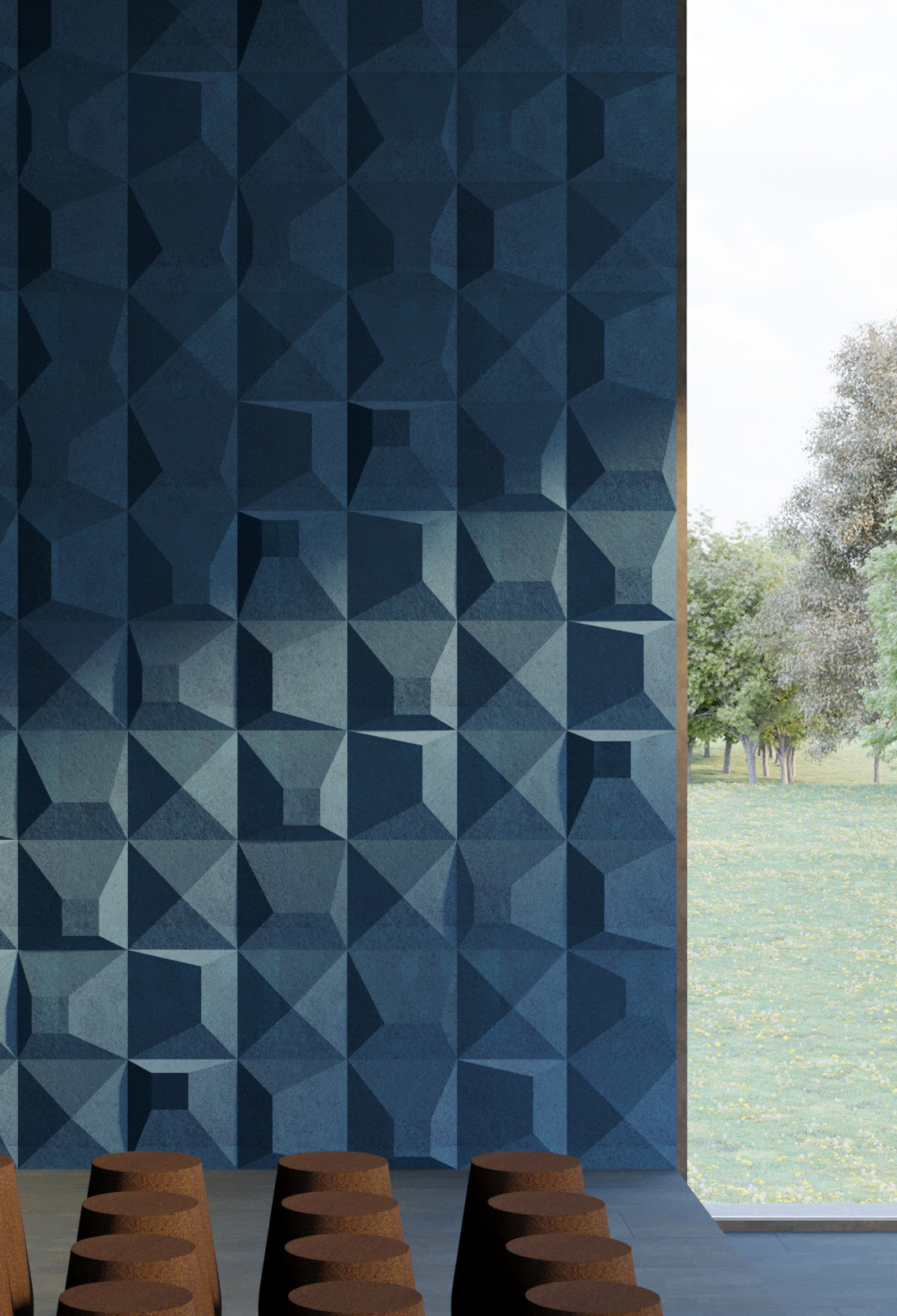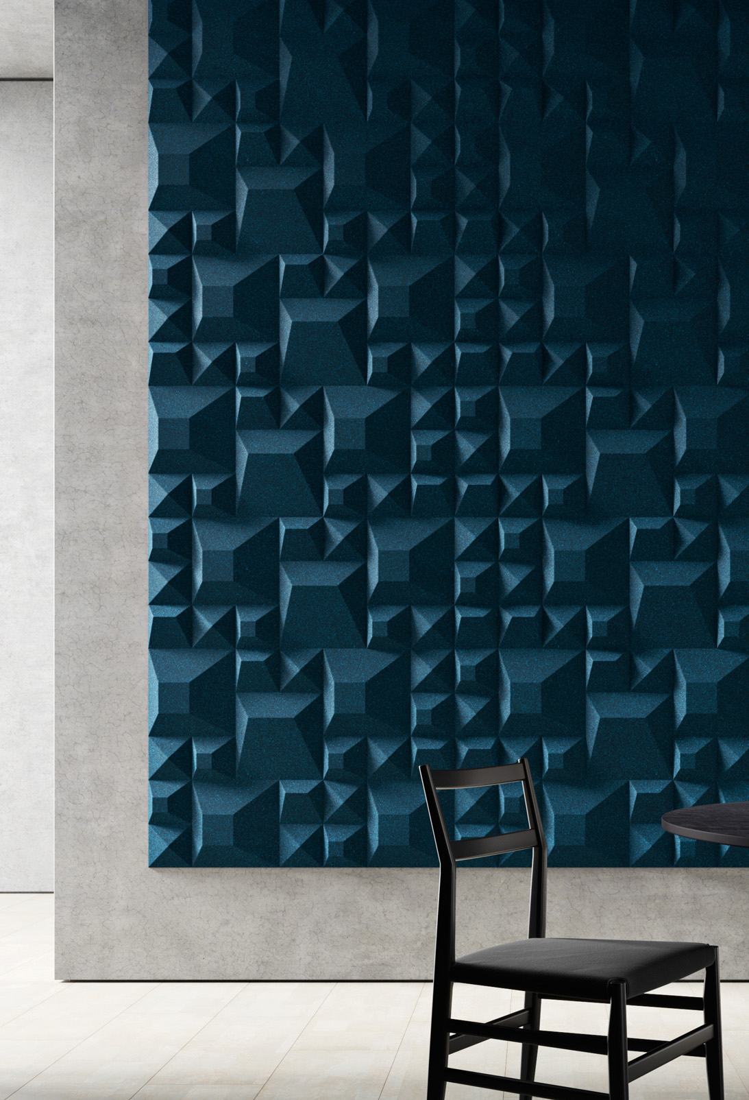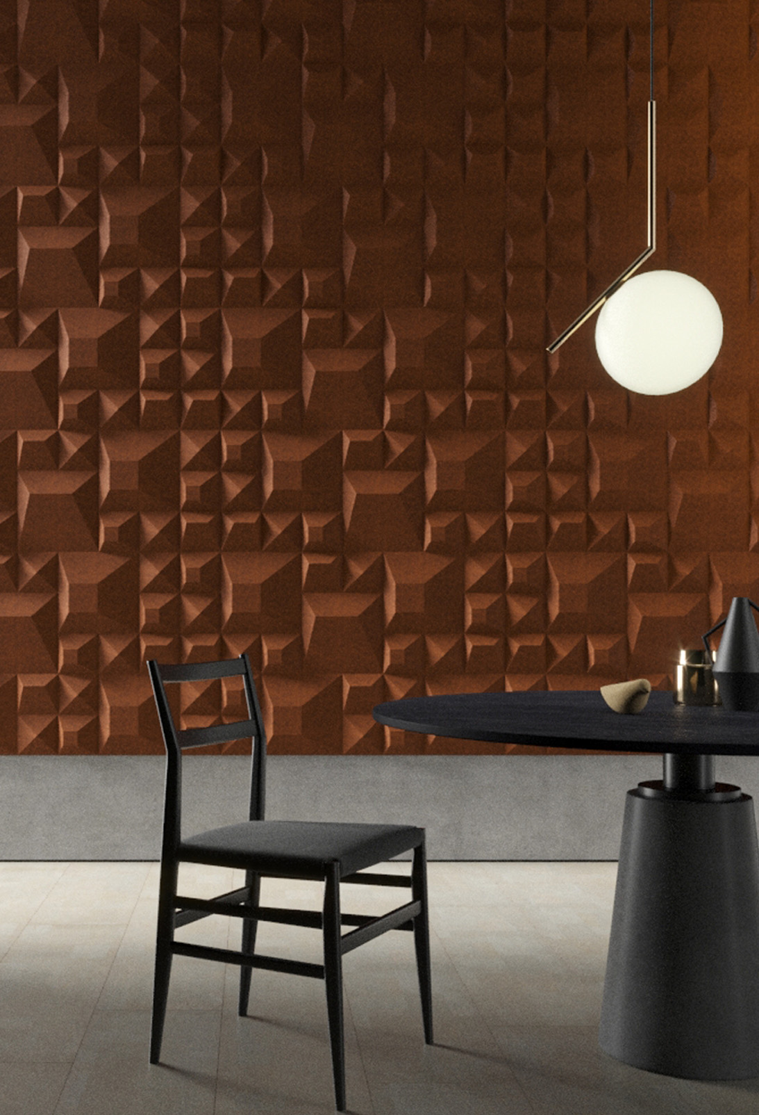 Modular cork tiles combine in various arrays to create unique three-dimensional patterns that add depth and character to vertical surfaces. Offering endless creative possibilities, they provide a unique texture and optimized intrinsic acoustic and thermal properties.