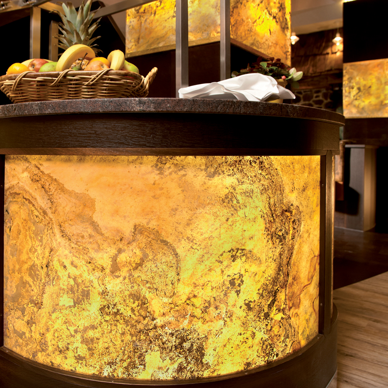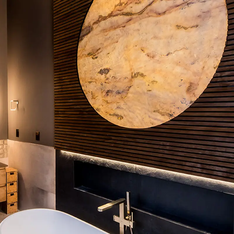 Translucid Slate is an ultra-thin, flexible natural stone veneer with a translucent backing, allowing light to pass through for a stunning backlit effect. Made from real slate, it retains the rugged texture and rich tones of natural stone while offering modern design versatility. Ideal for illuminated walls, panels, and decorative applications, it enhances both interior and exterior spaces with a unique blend of natural beauty and contemporary innovation. Its durability and easy installation make it a striking choice for sophisticated architectural projects.